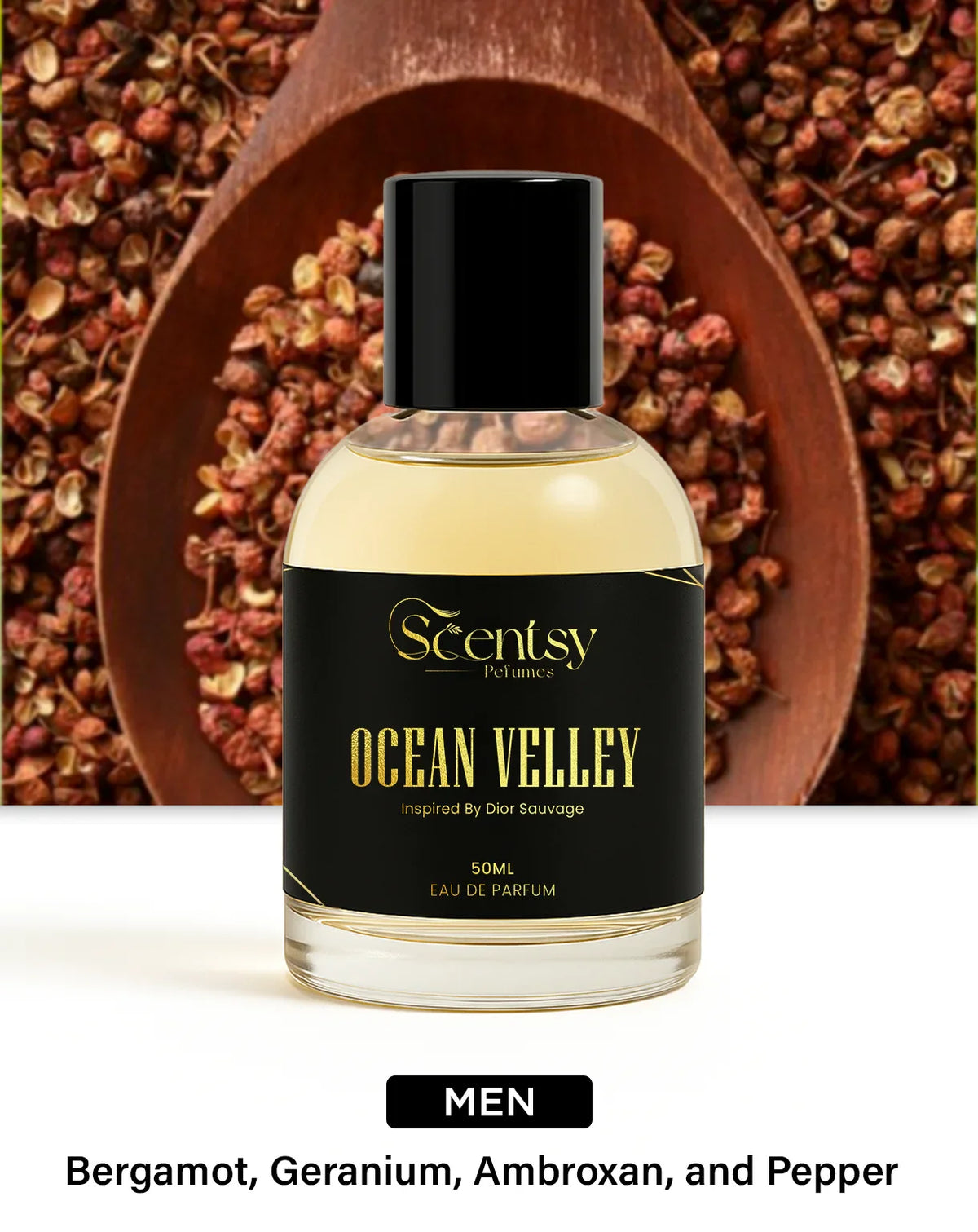 Ocean Valley Inspired by Sauvage Christian Dior, This is a statement scent—clean but primal, luxurious but free-spirited. It feels like a tailored black suit worn under desert skies. Fresh enough for day, magnetic enough for night, and confident at every hour.
